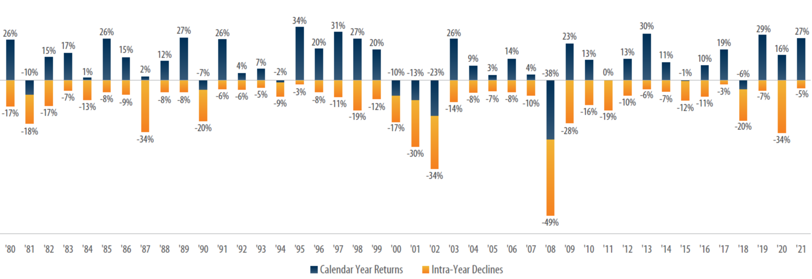 The past week’s negative price movement in the market represents two expected developments. First, a long-awaited tightening of growth was an unavoidable consequence of higher interest rates in the campaign to fight inflation. Second, experience shows that moderate pullbacks in the market happen a few times each year. Though short-term volatility dominates headlines, intra-year declines in the market are never the full story. As the graph below demonstrates, judging the market only by its worst days fails to capture the associated upside.1