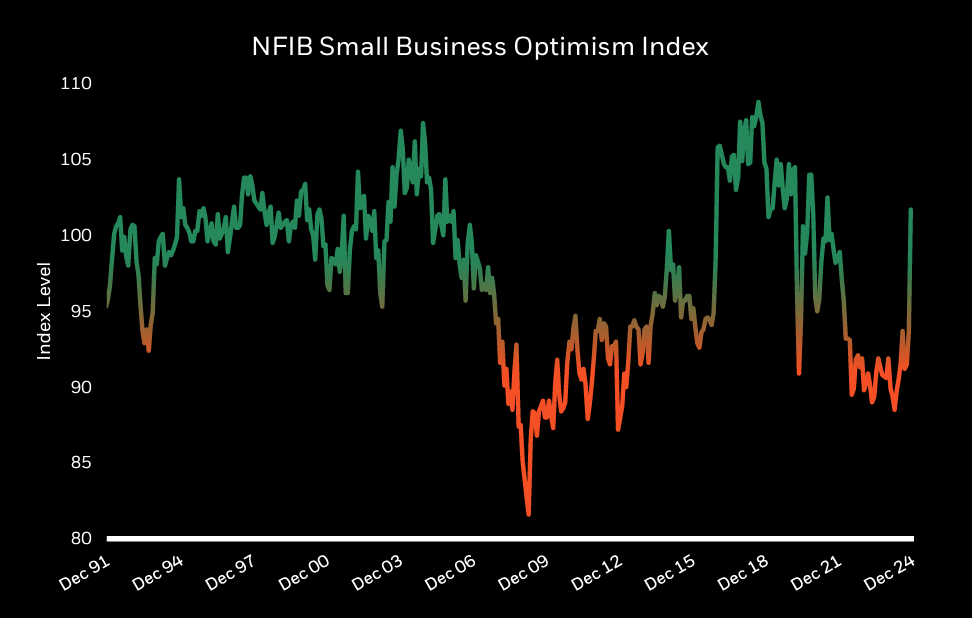 On a similarly positive note, the NFIB Small Business Optimism Index turned positive for the first time since the Covid-19 pandemic. Small business owners that were waiting for volatile moments like the 2024 Presidential Election to pass have begun investing at multi-year highs over the past 2 months.11