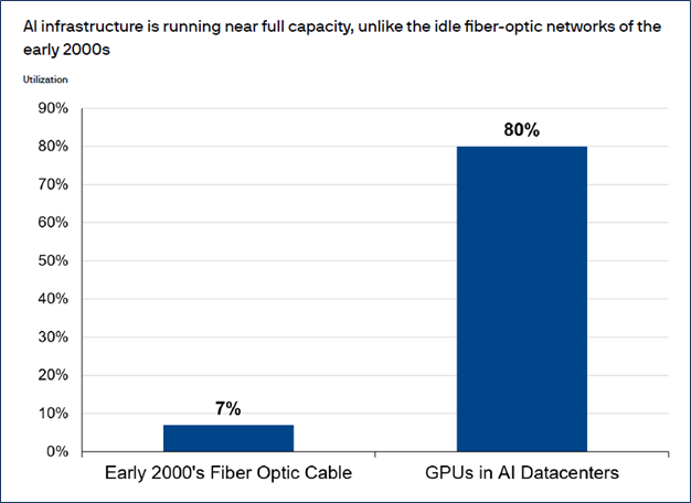 Demand fundamentals also look different. At the peak of the dot-com era, only 7 percent of fiber optic network capacity was being used. Today, data center utilization is roughly 80 percent.10 AI adoption remains early in its development, and although the scale of investment raises questions about ultimate returns, current fundamentals suggest that AI will continue to be a driving force in the market.