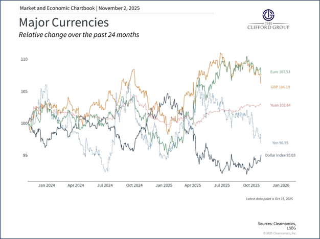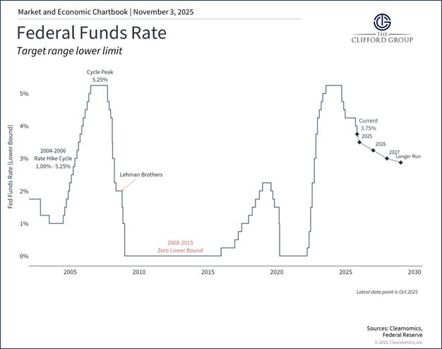 During his press conference announcing the October cut, Fed Chair Jerome Powell emphasized that a third cut in December is not assured.3 Many viewed this as a more hawkish signal than expected. It likely reflects, at least in part, the fact that the Fed is operating with less economic data than usual. The ongoing federal government shutdown has delayed the release of labor market statistics along with other important indicators.4