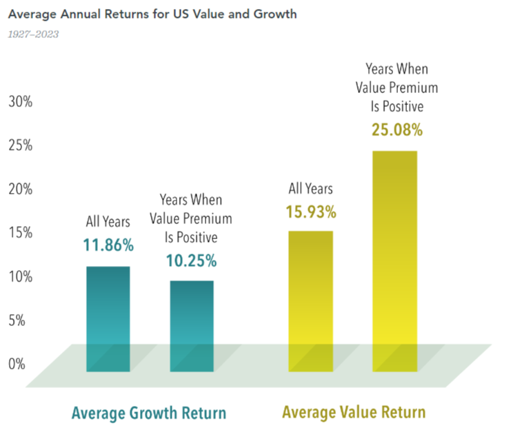 We see opportunity in value stocks as well.  While growth stocks have dominated headlines this year, value stocks appear well positioned.  When growth positions briefly faltered at the beginning of August, value stocks performed.  More important to keep in mind, however, is that the market is not a zero-sum game between growth and value.  As the chart below shows, the average annual return for value stocks is higher than that of growth positions.  In years where value outperforms growth, growth still averages a positive return.  There is, more often than not, upside to both styles.11