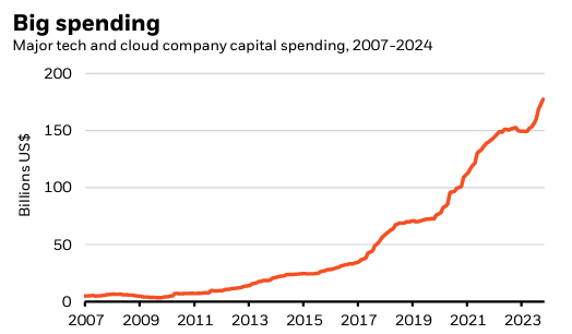 As we discussed in our August Market Insights, headline-grabbing earnings over the past few months have mostly focused on technology, artificial intelligence, and expectations surrounding when AI investment would start to show returns.  We have seen in recent earnings calls, and outlined in the chart below, that capital spending on AI and AI supporting technology has continued.13