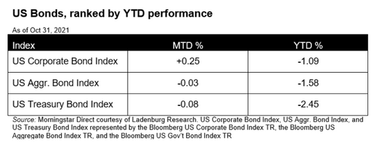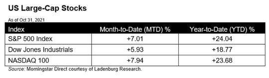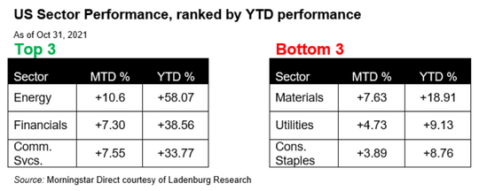 Energy stocks continue their stellar performance in 2021, up 10.36% for the month and 58.07% year-to-date, as of October 31! Financials and Real Estate continue their strong 2021 campaign, both outperforming the broad S&P 500 Index for the month.