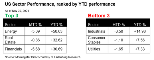 Energy retained its spot as the top-performing sector this year, however, not without a volatile November. Real Estate leap-frogged into the top-three by losing less than Financials, which dropped nearly 6% in November.