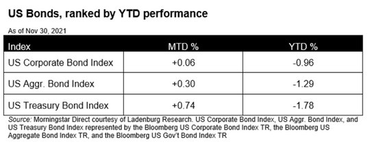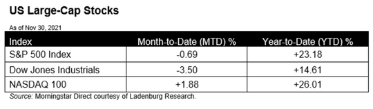 Stocks were mostly negative this month as the market digested news of the latest COVID-19 variant and the potential implications of tightening monetary conditions.