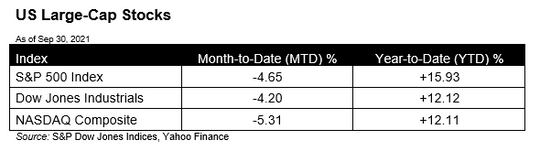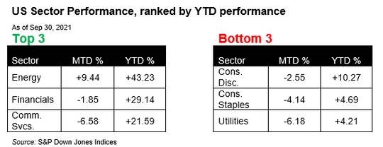 Energy stocks were the lone positive sector in September, posting a +9.44% return for the month. With a year-to-date return of +43.34%, Energy stocks have handily outperformed the broad S&P 500 Index. Financials and Communications Services stocks struggled in September, though both continue to sit at the top of the sector leaderboard for 2021.