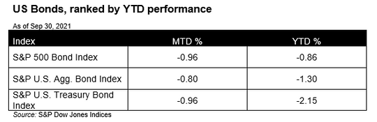 Bonds continue to struggle in 2021, with all three indexes producing negative returns in September. Corporate bonds (represented by the S&P 500 Bond Index) briefly turned positive in August before falling in September in the wake of the potential Fed taper news.